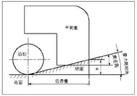 內(nèi)燃叉車平衡重下端的離去角也很重要,該角度主要是為了避免上、下坡時(shí)平衡重下端與地面摩擦,理論上離去角與具體車型的大爬坡角相等。平衡重下端切除點(diǎn)的位置要根據(jù)具體車型的大爬坡度、平衡重的后懸量來(lái)確定。本文以爬坡度20%、平衡重后懸量715 mm進(jìn)行計(jì)算,如圖所示。平衡重外側(cè)離地高度H計(jì)算公式如下: